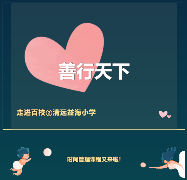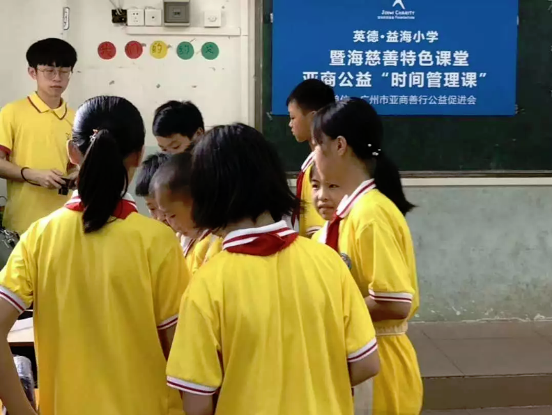 广州市亚商善行公益促进会作为广州暨海慈善基金会的战略合作伙伴,于2019年5月18日一起走进英德益海小学。促进会的志愿者老师杜碧嘉和吴伟霞老师为益海小学50多位小朋友举办了一堂生动有趣的“时间管理”课程。通过“动物寿命抢答”以及“撕纸片”等游戏的引导,激发学生对时间和生命的思考,展开自己对未来的畅享。