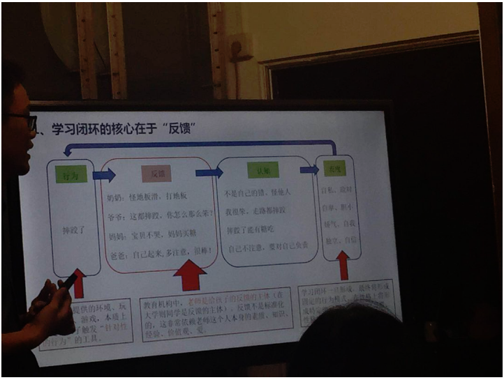 吴老师的分享后,各位志愿者老师各抒己见,一一表达了自己对教育理念和方法以及教育现状的见解和想法。尤为印象深刻的是,语言学博士陈淑君老师阐释的言语反馈对于行为的影响,并拓展到体验派哲学和英美语言时态对于中美乐享当下以及为未来准备心态的影响。