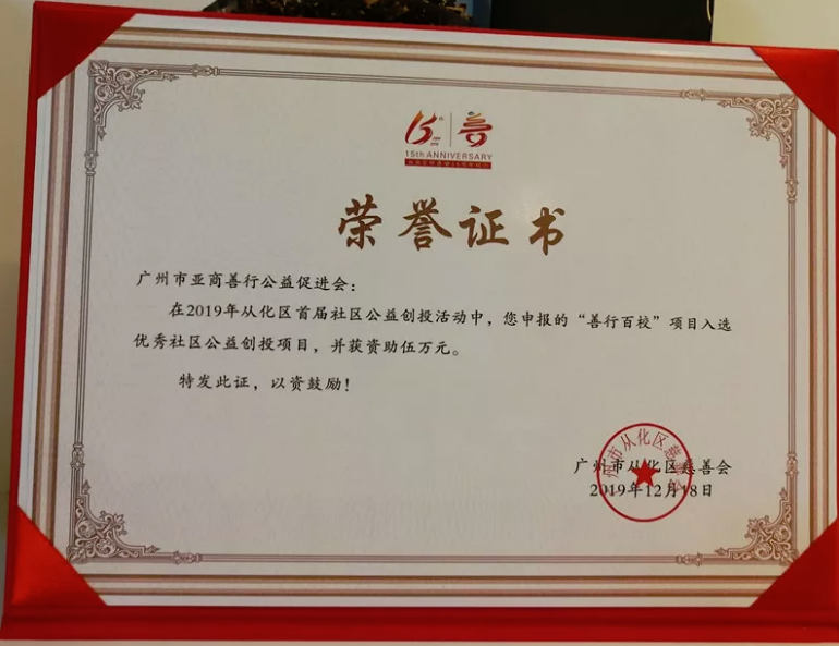 广州市亚商善行公益促进会的“善行百校”项目,在2019首届从化社区公益创投活动中,得到从化区慈善会的认可,入选为优秀社区公益创投项目。